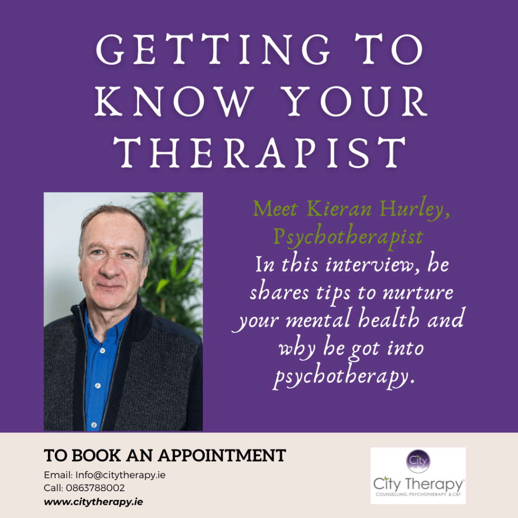 In today’s “Getting to know your therapist” we are delighted to have the opportunity to interview Kieran Hurley. He is an accredited Psychotherapist from City Therapy’s clinic in Rathmines Dublin. Kieran has experience working with many issues, such as anxiety, trauma, depression, and grief.