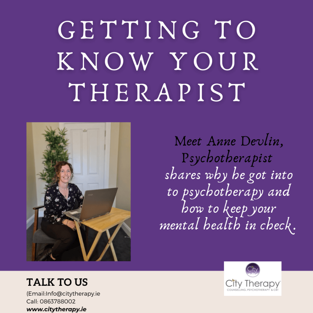 In today’s “Getting to know your therapist” we are delighted to have the opportunity to interview Anne Devlin. She is the co-founder of City Therapy and a practicing Psychotherapist at City Therapy, Dame Street, Dublin.